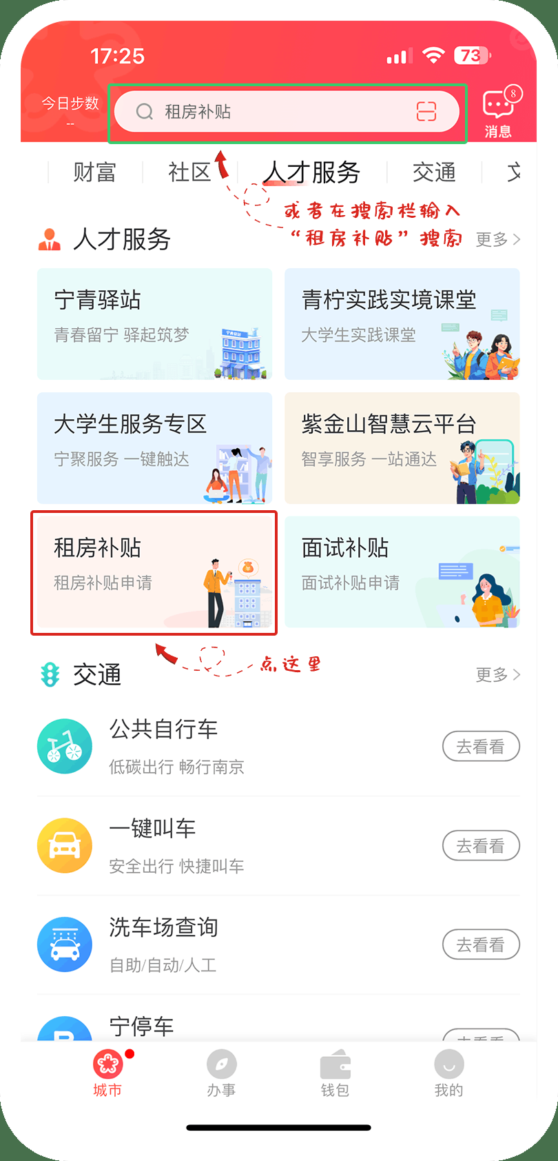 1️⃣下载并注册“我的南京”APP,下拉页面至“人才服务”版块,点击进入“租房补贴”;或者在顶部搜索栏直接搜索“租房补贴”进入模块专区。