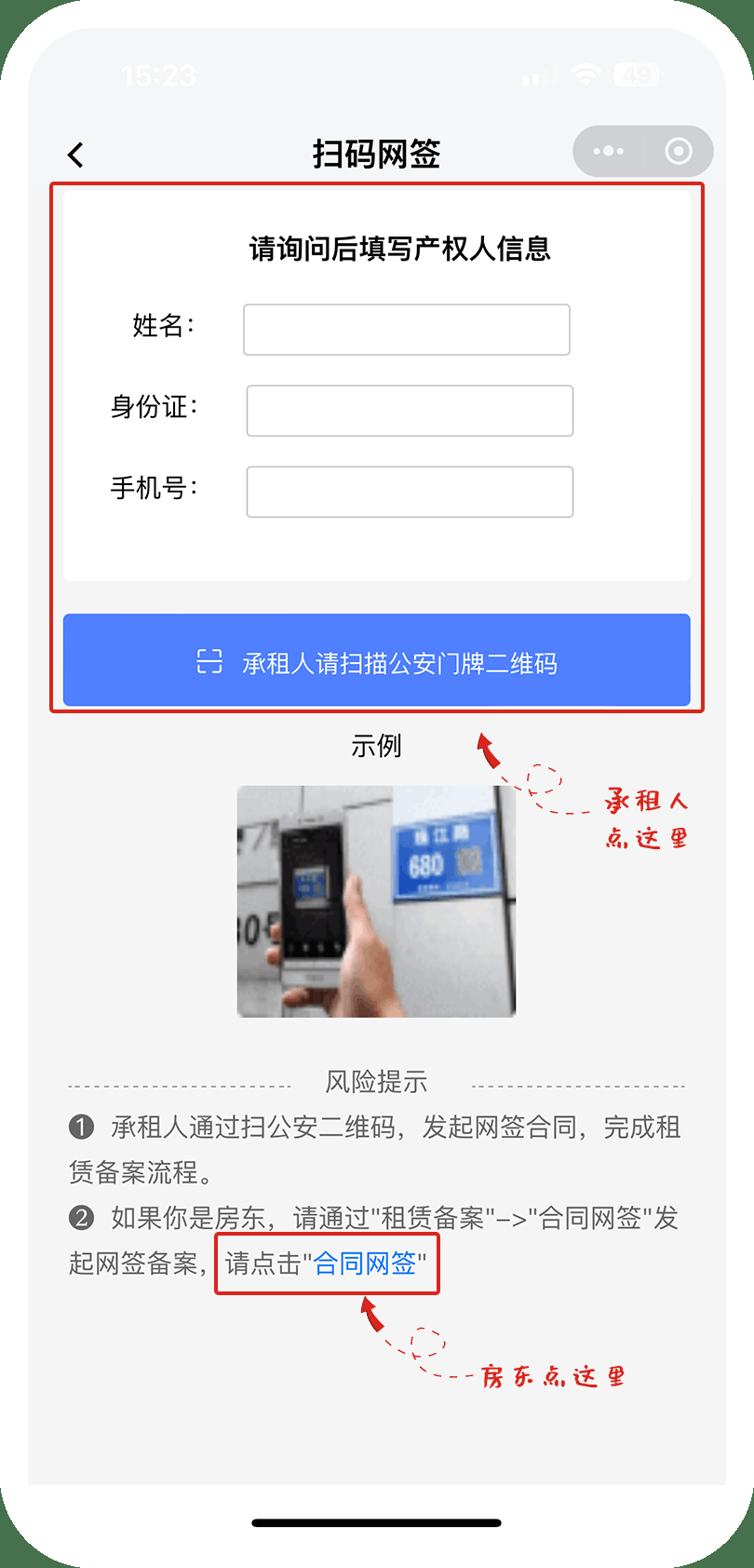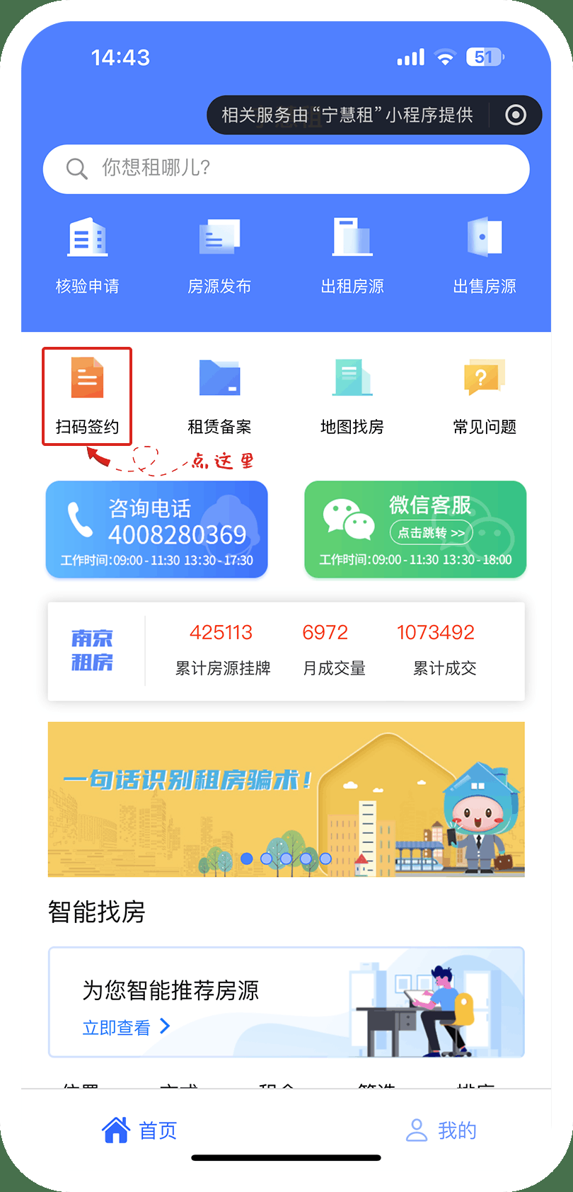 从“房帮宁”平台进入“房屋租赁·宁慧租”小程序后,点击“扫码签约”。签约方式有两种,第一种是承租人发起,填写产权人信息,扫描公安门牌二维码即可进入网签程序。第二种是房东发起,房东点击“合同网签”按钮发起网签程序,承租人通过“我的”-“我的合同”进行合同确认,完成备案。