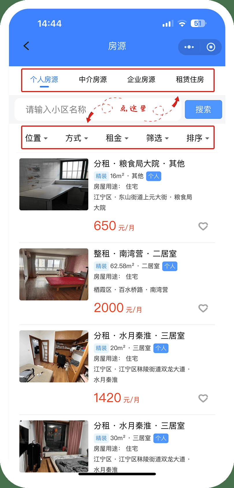 在“房帮宁”-“房屋租赁·宁慧租”平台点击“出租房源”,可以选择“个人房源”“中介房源”“企业房源”“租赁住房”四种租赁房屋类型,确定想要租赁的房屋类型后,通过对位置、租赁方式、租赁范围、房屋状况、价格、面积大小、排序等要素的筛选为定位心仪房源提高精准度。