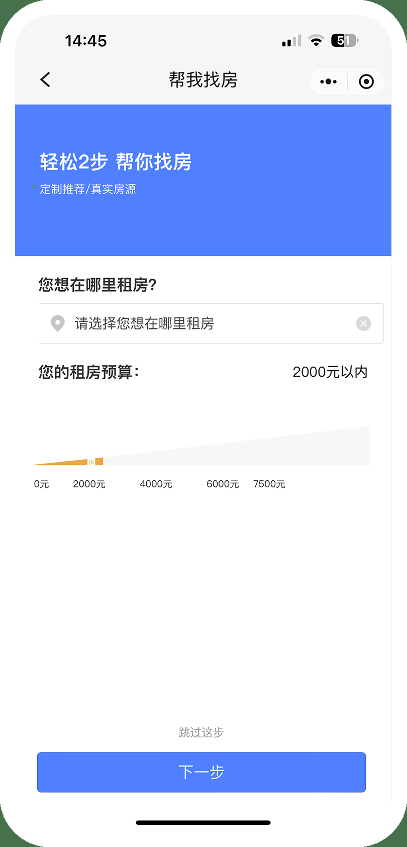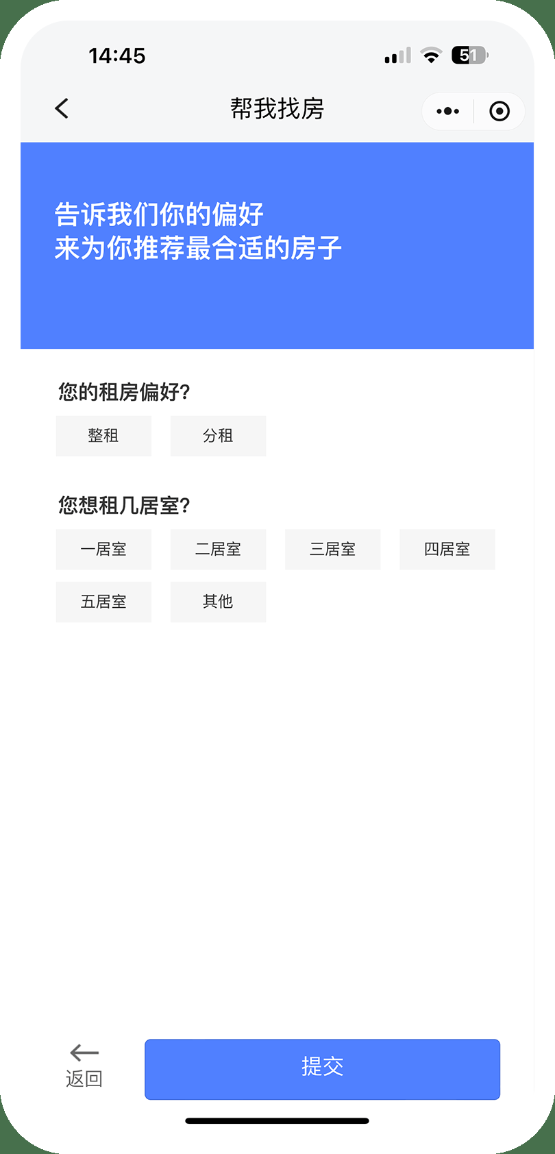 点击“智能找房”功能,填写目标小区、租房预算、租房偏好,即可获取智能定制推荐房源。