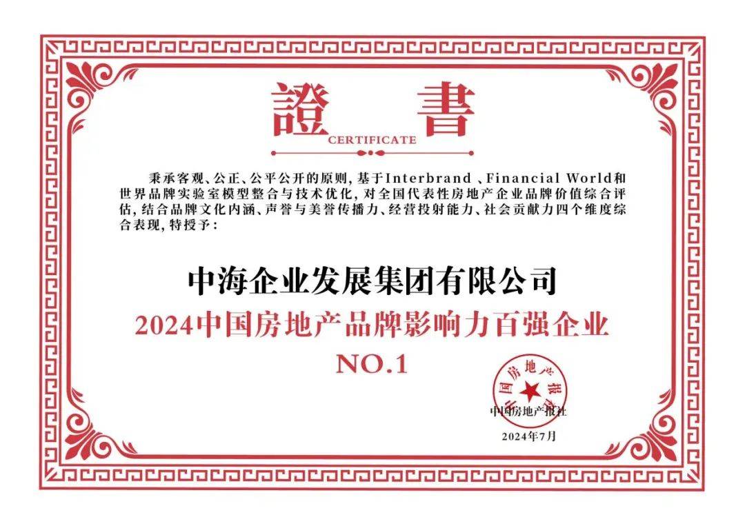 7月10日,由中国房地产报、中国城市与区域治理研究院主办的2024第十四届中国房地产品牌发展大会在京召开,并重磅揭晓“2024中国房地产品牌影响力100强”榜单。中海企业集团凭借高质量发展及品牌卓越表现,荣获“2024中国房地产企业品牌价值百强企业第一名”,还获评“2024 中国房地产品牌社会贡献力企业”殊荣。