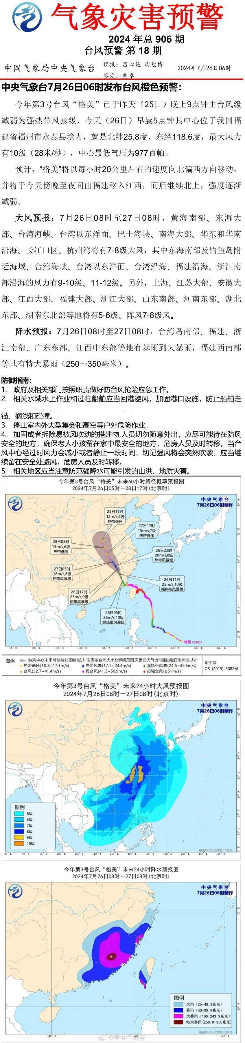 中央气象台7月26日06时发布台风橙色预警。