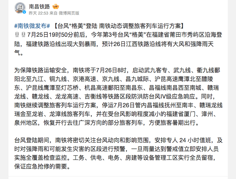 预计今天江西铁路沿线将有大风和强降雨天气。南铁继续调整旅客列车运行方案,停运7月26日管内昌福线抚州至南丰、赣瑞龙线瑞金至龙岩、龙漳线旅客列车,并在受台风影响程度减小的福建省厦门、漳州、泉州地区,恢复开行去往广深方向的部分旅客列车,方便旅客暑期出行。
