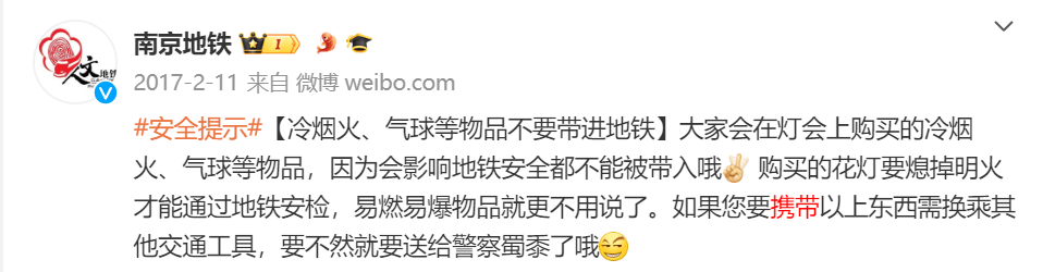 冷烟火、气球等物品,因为会影响地铁安全都不能被带入地铁。