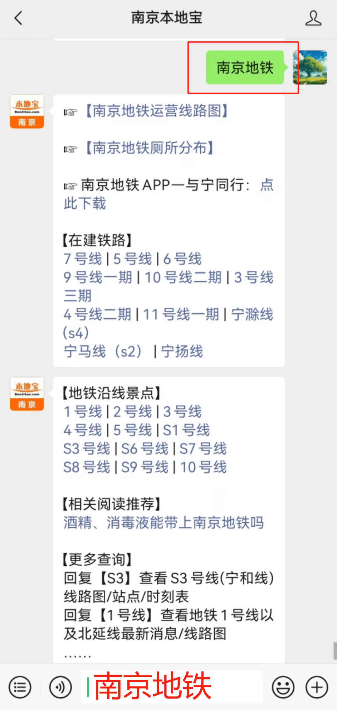 在首页下方对话框回复【南京地铁】