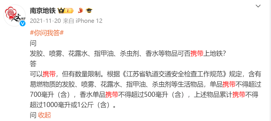 可以携带,但是有容量限制。根据《江苏省轨道交通安全检查工作规范》规定,含有易燃物质的发胶、喷雾、花露水、指甲油、杀虫剂等生活物品,单品携带不得超过700毫升(含),香水单品携带不得超过500毫升(含),上述物品累计携带不得超过1000毫升或1公斤(含)。